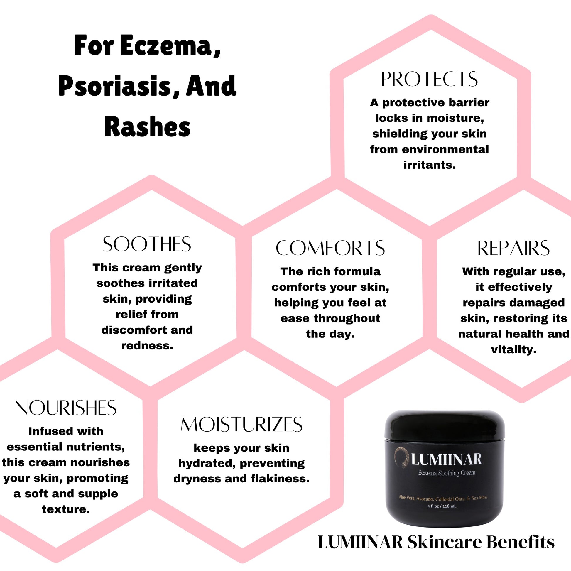 Lumiinar Eczema Soothing Cream is designed to provide relief from symptoms associated with eczema, psoriasis, dermatitis, and dry, itchy, or irritated skin. It hydrates, soothes, and strengthens the skin’s natural barrier.