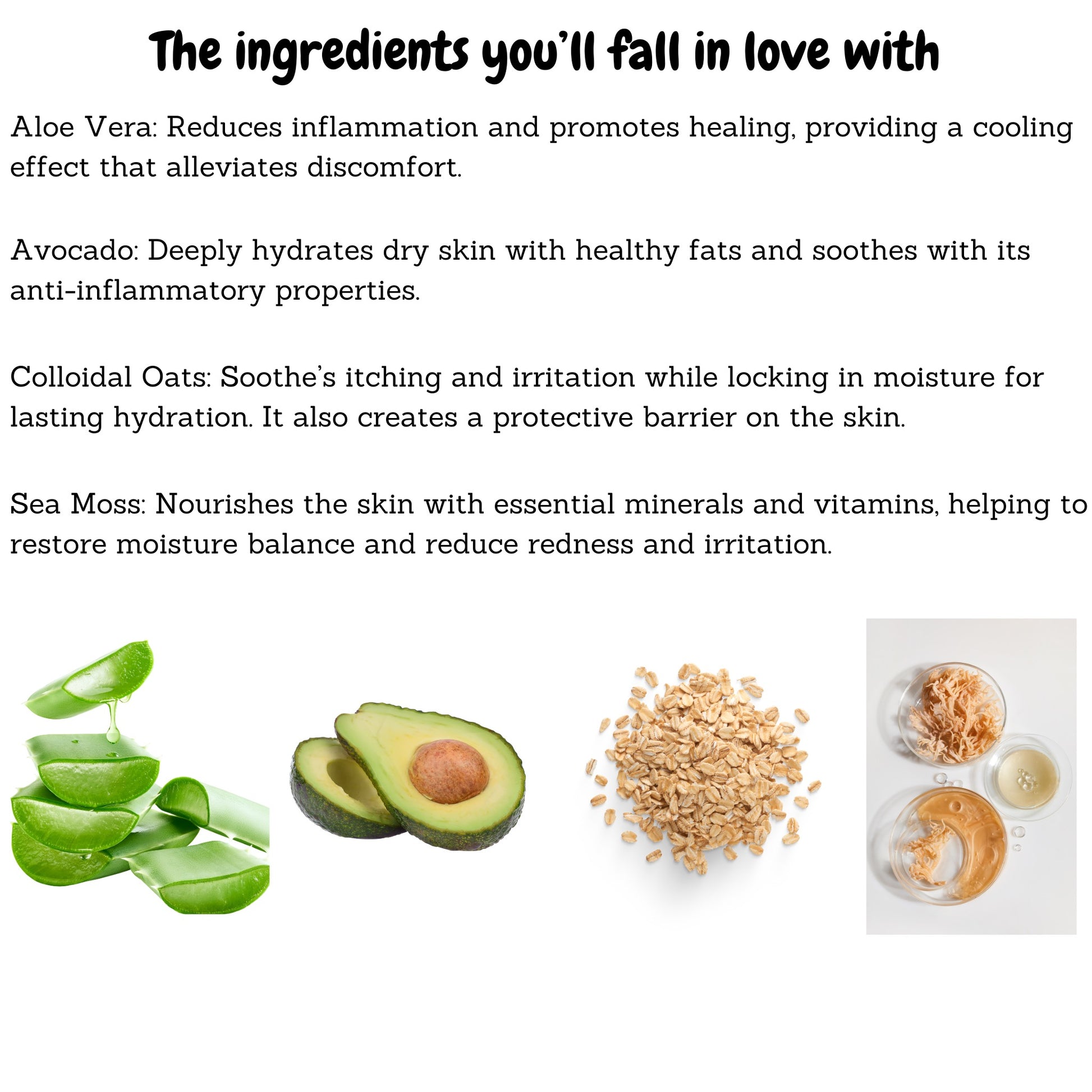 As a Licensed Esthetician, I’ve blended my personal journey with my passion for skincare. Working with several skincare professionals to create the perfect product. Each ingredient in this cream is chosen with care and purpose. We’re talking about the soothing magic of Organic Aloe Vera Juice, nourishing Avocado, and calming Colloidal Oats and Sea Moss, all working together to give your skin the love it needs.